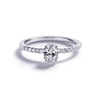 ”Fancy Love” solitairering i 18 kt. gulguld prydet med oval 0,50 ct. River(D-E)-Top Wesselton/VS diamant, flankeret af 16 Top Wesselton/VVS-VS brillanter, i alt 0,18 ct.